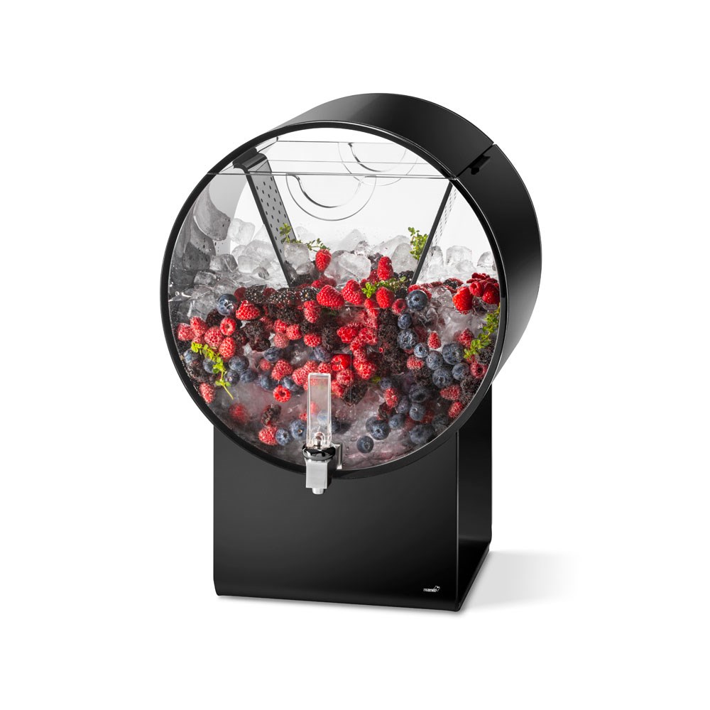 Rosseto’s Lucid Barrel black 18.9L beverage dispenser is highly functional, reliable, and is made with top-quality acrylic. It offers an intriguing and futuristic shape along with a crystallized faucet that will draw attention to any beverage. The removable infuser chamber creates the perfect infused water dispenser, simply add fresh herbs and fruits to create a refreshing customized beverage.