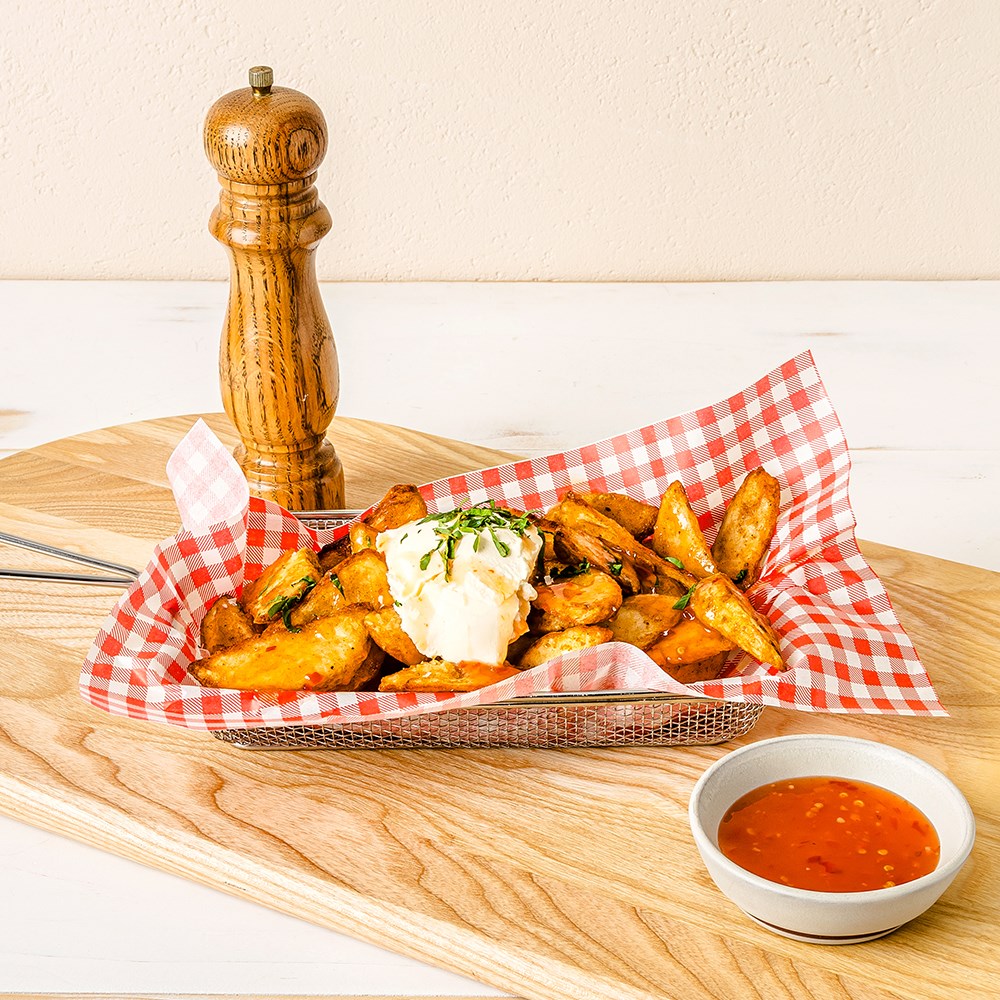 The Deli Wrap Greaseproof Gingham 190x310mm by Pro.mundi is a versatile and stylish addition to any food service. Perfect for use in service baskets, pails, presentation boards, and more, this greaseproof paper helps elevate your dining experience.