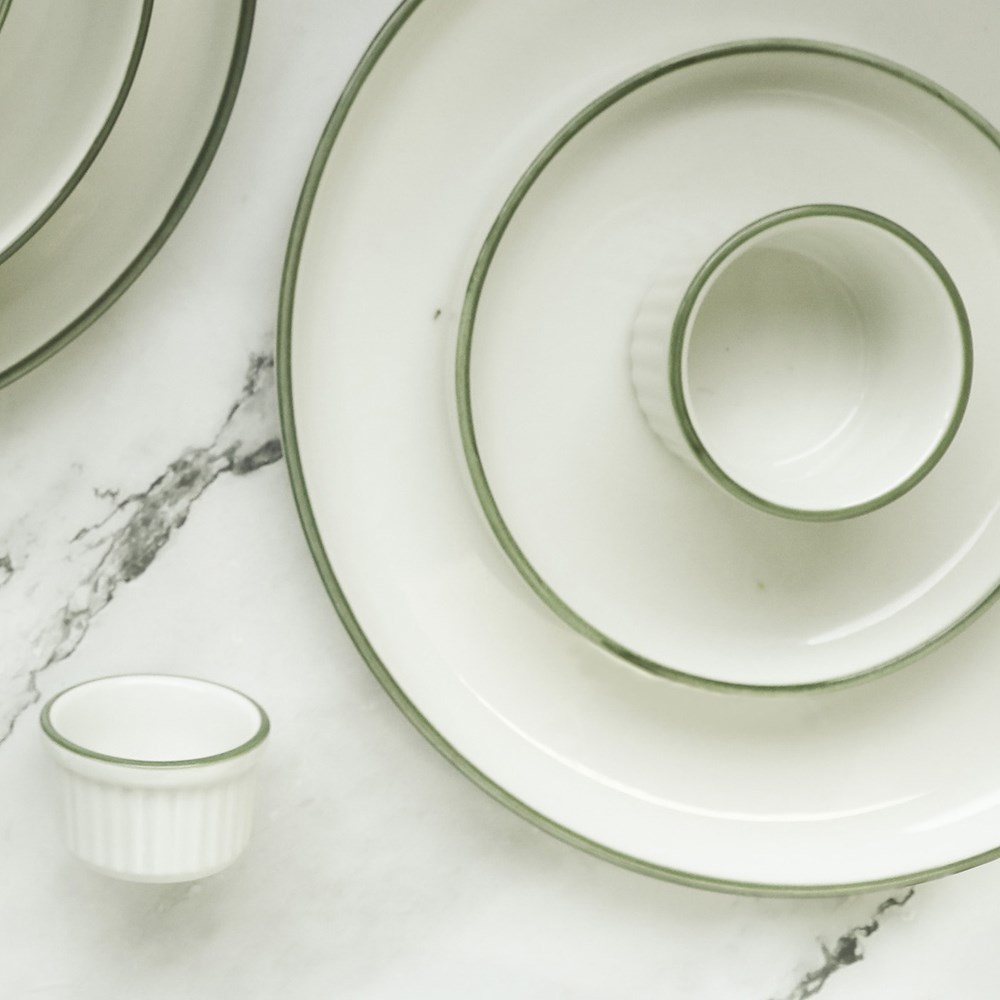 The Homestead 80mm Sauce Dish features a soft creamy white surface with a hand painted olive band on all pieces in this range by NMC. This collection of sauce dishes, ramekins, plates and bowls combine elegance and functionality setting the perfect backdrop for your menu.
