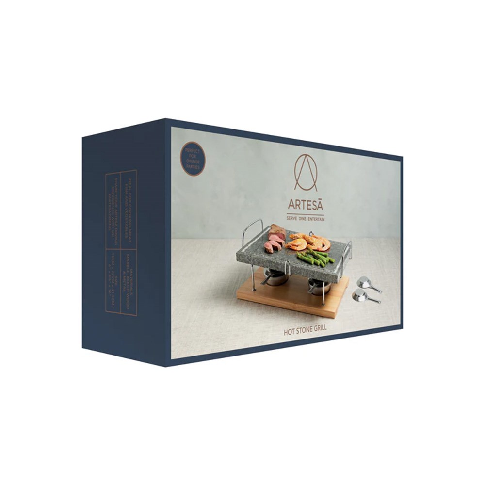 Create a memorable dining experience for your guests with the Artesa Natural Marble Hot Stone Grill 420x140mm. It is designed for restaurants, hotels, and event venues seeking to elevate guest interaction. This tabletop grill allows diners to cook their own steak, seafood, or vegetables directly at the table. The natural marble slab retains heat for extended periods, ensuring consistent cooking performance. It also features integrated channels to drain excess juices for a cleaner, healthier result. Staff only need to preheat the stone in the oven and place it over the gas burners for an oil-free cooking solution.
