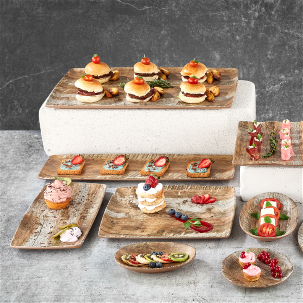 Crafted from quality melamine, this range offers the look of real wood without the maintenance challenges. Melamine is known for its durability, making it resistant to stains, scratches, and breakages - ideal for busy venues, caterers, and event planners. It is lightweight and robust ensuring easy handling and longevity, even with frequent use in high traffic environments.