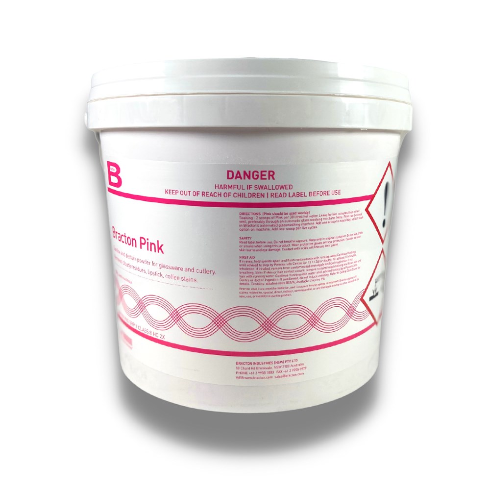 Bracton Pink Soaking Powder removes the heaviest stains with ease. Destaining all glassware, china, plastics and cutlery ensuring sparkling hygienic results every time. We recommend that beverage glasses have a deep clean every week to ensure perfect glasses.