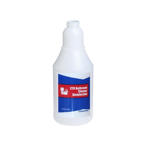 The CTR Bathroom Cleaner & Disinfectant Bottle by Ecolab is a durable, clearly labelled empty decant spray bottle designed for use with Ecolab's bathroom cleaning solutions. Ideal for professional cleaning environments, this bottle allows for safe and efficient application of disinfectant across bathroom surfaces.