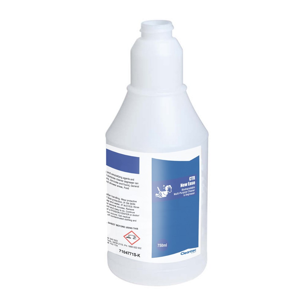 The CTR New Ease Spray Bottle by Ecolab is a 750ml empty decant spray bottle designed for use with Ecolab's New Ease cleaner. Built for efficiency and ease of use, this sturdy bottle supports safe, accurate dispensing of diluted cleaning solutions. It's a reliable tool for maintaining hygiene across commercial kitchens, restrooms, and other high-use areas.