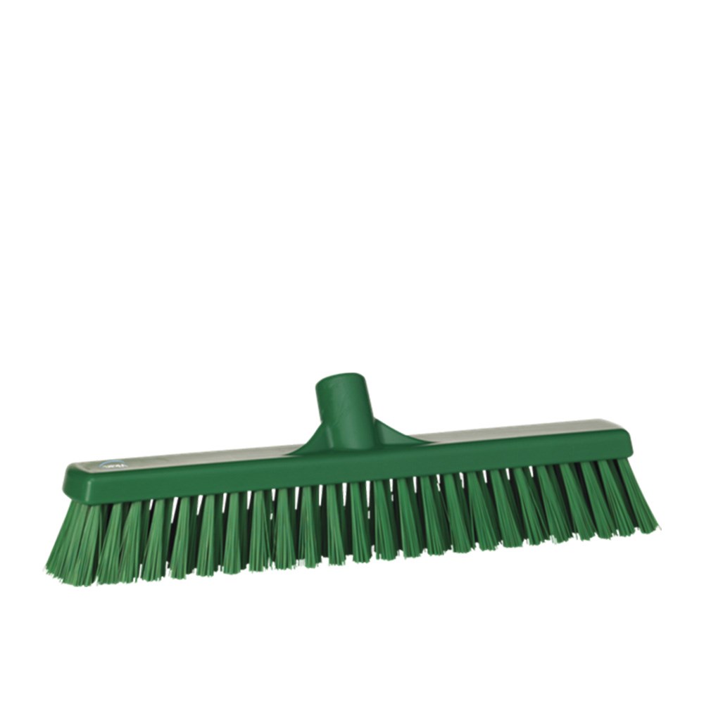 The Vikan Soft and Hard Broom Head 410mm in green colour can remove heavy and large particles from both wet indoor and outdoor surfaces due to its heavy-duty build. It is compatible with any Vikan handle and is ergonomically designed for easy use and storage. Food grade certified and is available to use in any environment, especially in hygiene-sensitive facilities. Available in other colours, which is perfect for coded options to prevent cross-contamination