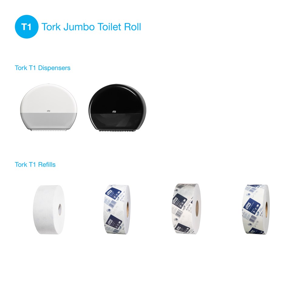 Tork T1 Jumbo system reduces servicing costs and the risk of run out for the busiest washroom. Easy to service & maintain. Recognising that first impressions count the award winning black Tork Elevation dispenser will lift the washroom to a new level.
