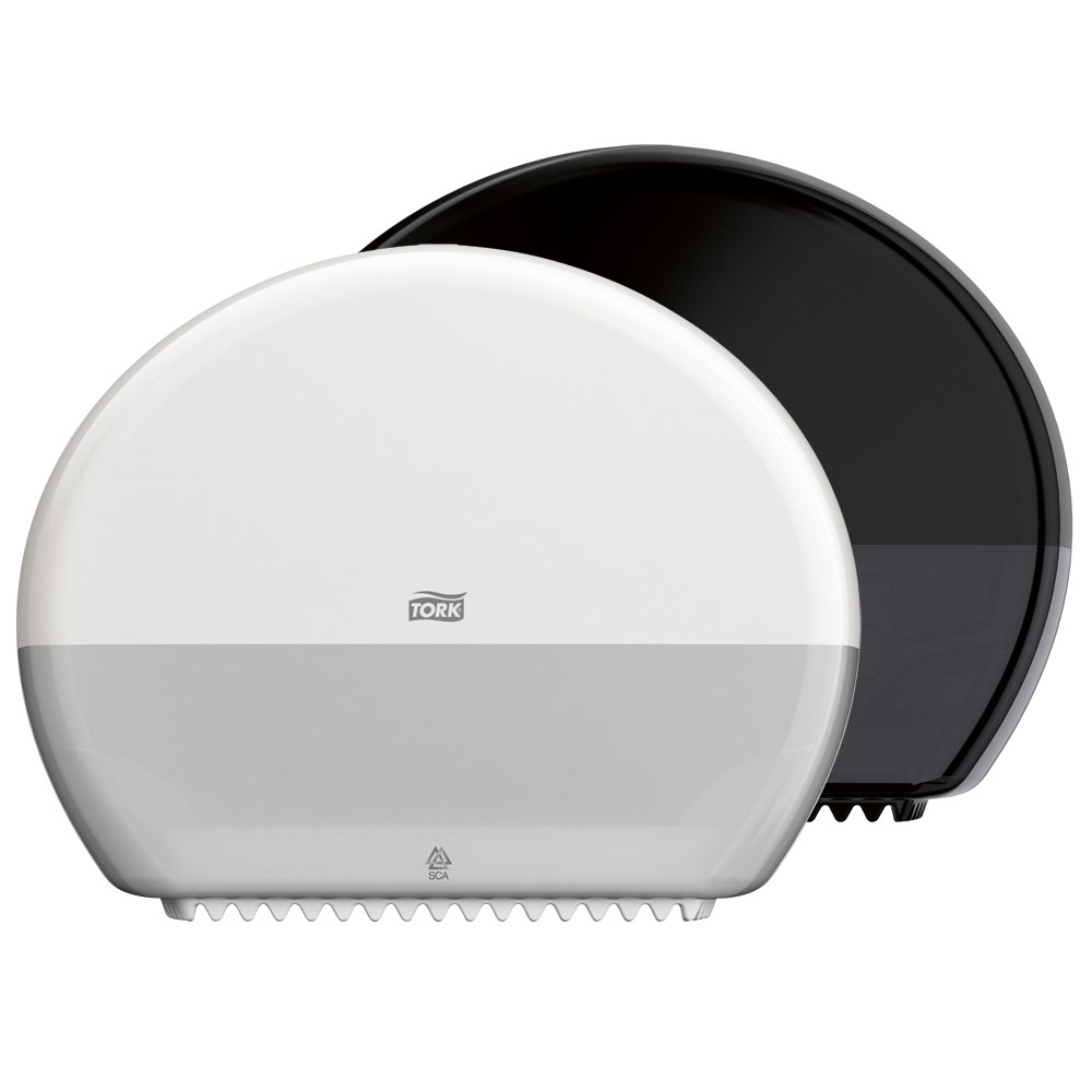 Tork T2 Mini Jumbo Black system is a very high capacity yet compact choice for washrooms. The back up roll ensures that dispensers always have enough toilet tissue reducing the risk of run out and reducing servicing time. Recognising that first impressions count the award winning white Tork Elevation dispenser will lift the washroom to a new level