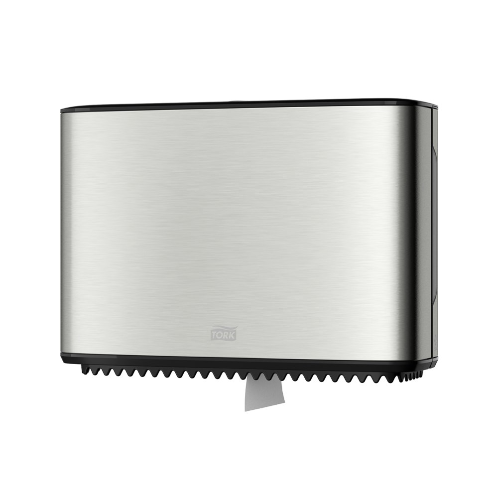 Tork T2 Mini Jumbo dispenser. A modern design with smooth surfaces and clean lines that fits seamlessly in your washroom. Create a great impression that boosts the high-quality image of your facility. Stylish stainless steel with anti finger print coating looks great and stays clean