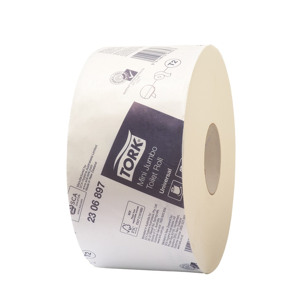 Tork T2 Universal paper offers quality single ply toilet tissue. The mini jumbo toilet roll is ideal for washrooms with a steady number of visitors. The paper is FSC certified and accredited with NZ Environmental Choice guaranteeing environmentally responsible purchasing.