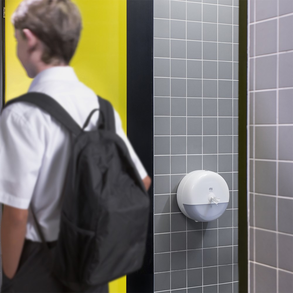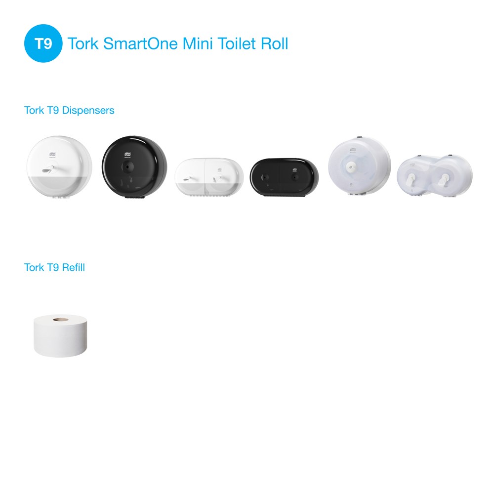 The Tork SmartOne Mini Toilet Roll System delivers one hygienic sheet at a time, helping to reduce consumption by up to 40% compared to traditional jumbo roll dispensers. Tork SmartOne Mini high-capacity rolls are suitable for demanding washrooms from low to medium to high traffic, and are compatible with the Tork SmartOne T9 dispensers.