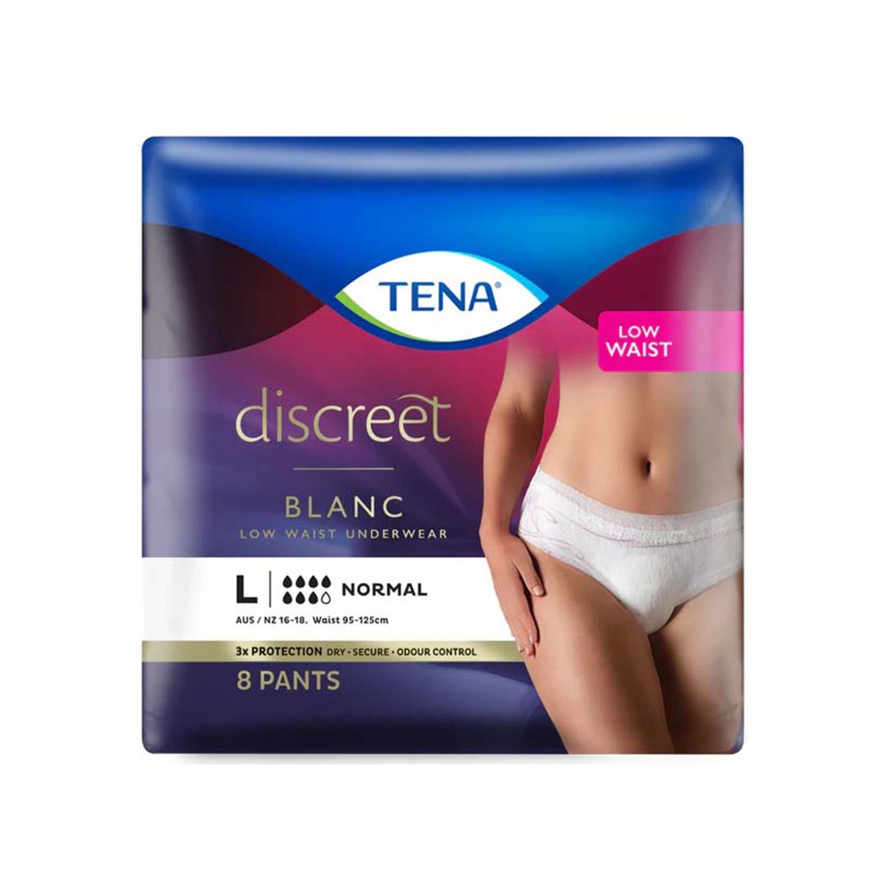 The Discreet Low Waist Pants (L) in blanc from Tena in crisp white combine a sleek, low-lingerie waistline with dependable incontinence protection. Designed for moderate to heavy bladder weakness, they deliver reliable defence without compromising on style. The slim, discreet fit conceals a triple-action core that locks away leaks, odours and moisture, while the breathable micro-stretch fabric ensures flexibility and all-day comfort.