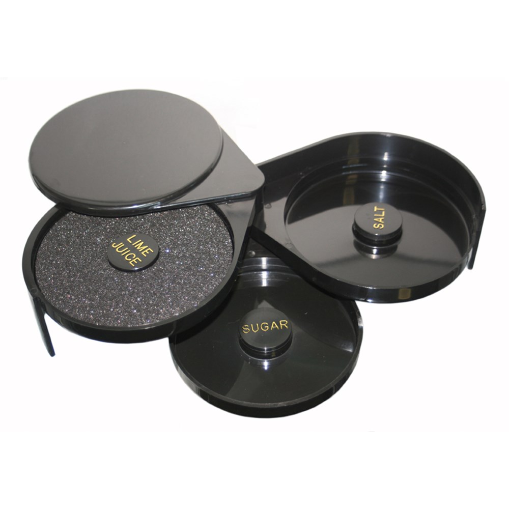 • Efficient Three-Tier Design: Easily rim glasses with salt, sugar, or lime juice using the convenient separate compartments of our Cocktail Glass Rimmer 3 Tier Black