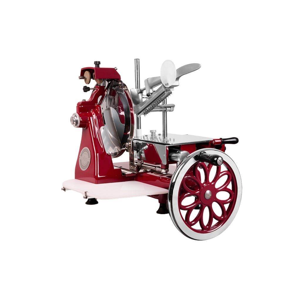 The Meat Slicer Volano Flywheel 300mm by Brice is a high-quality, unpowered hand-operated slicer, designed for precision slicing in professional kitchens. Featuring a 300mm blade, this stunning slicer is equipped with the iconic daisy flywheel for smooth operation. Constructed from durable aluminium and stainless steel with a striking red finish, it combines both style and functionality.