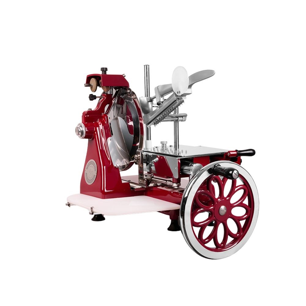 Constructed from aluminium and stainless steel with a bold red finish, the Brice Meat Slicer Volano Flywheel 350mm includes a fully integrated sharpening device and a blade ring guard for safety. The adjustable slice thickness, ranging from 0 to 2.5mm, ensures accuracy with every cut, making it a standout choice for cafés, delis, and commercial kitchens that aim for efficiency and visual impact.