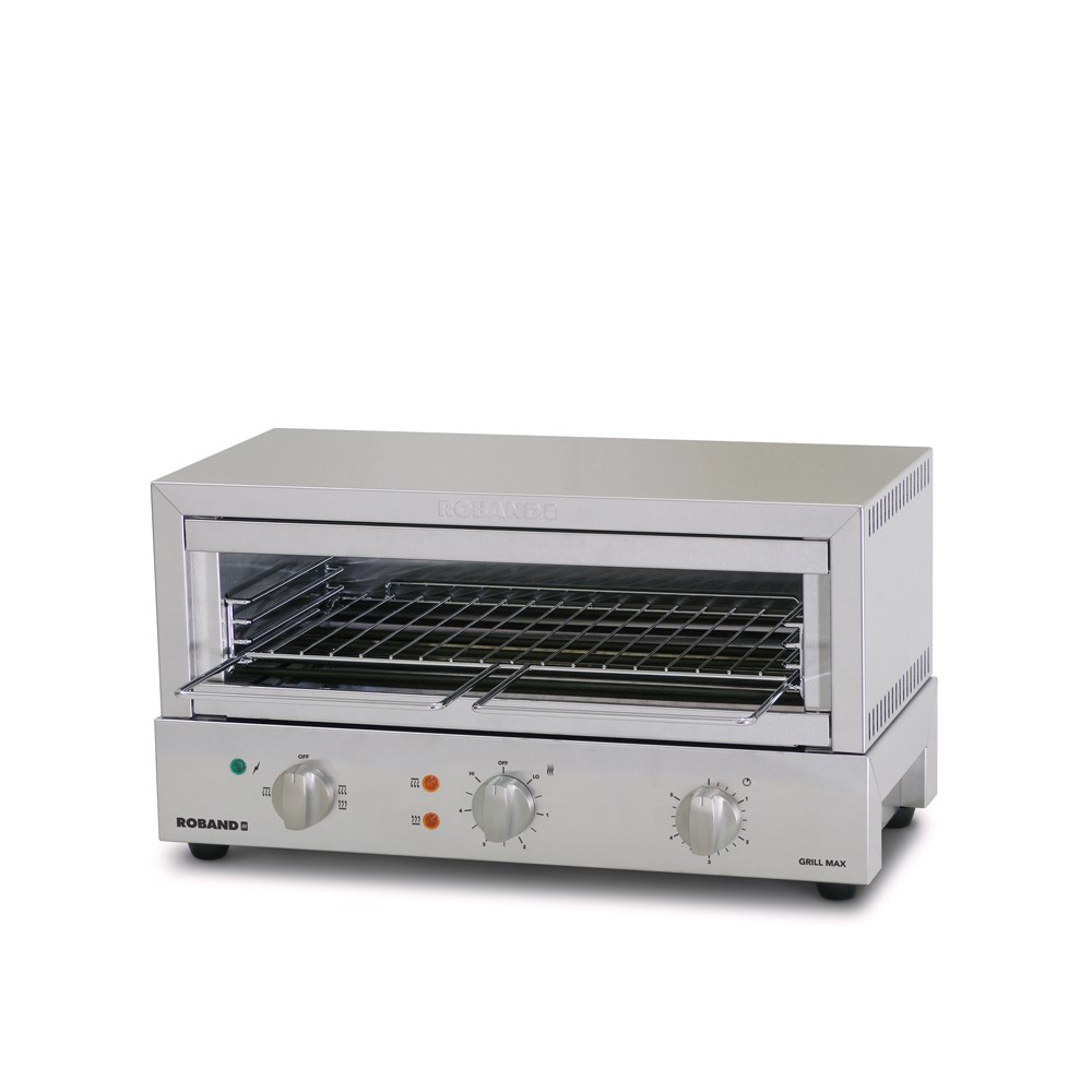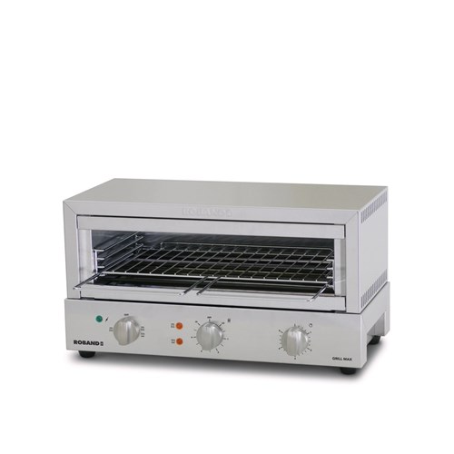 The Roband Grill Max Toaster is manufactured in Australia with Dura-life stainless steel elements, good heat retention meaning heat remains after elements turned off to keep food warm, brushed stainless steel body, energy regulator, 5 minute timer with bell, easy-clean removable crumb tray and reflector, top and bottom or top only heat selection and multiple rack positions. Max toasting height 79mm.