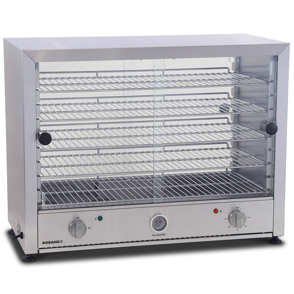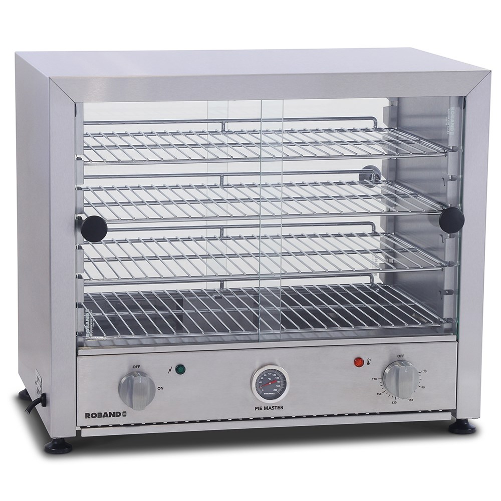 The PM-Series or Roband Pie Ovens features a brushed stainless steel body and adjustable feet and an easy to remove crumb tray for ease of cleaning. The display racks in these ovens can be positioned horizontally or at an angle and there is a stop rail on each shelf to prevent food from touching the glass doors and this range has the added benefit of an internal light to enhance the presentation of your food. There are three variations of these ovens available: ZF100679 - Pie Warmers with front and rear facing glass doors. Two sizes available. ZF100677 - Pie Warmers with a stainless steel back and front-facing glass doors, with an internal light and baffle tray with steam. Three sizes available. ZF100676 - Pie Warmers with a stainless steel back and front-facing glass doors. Three sizes available.