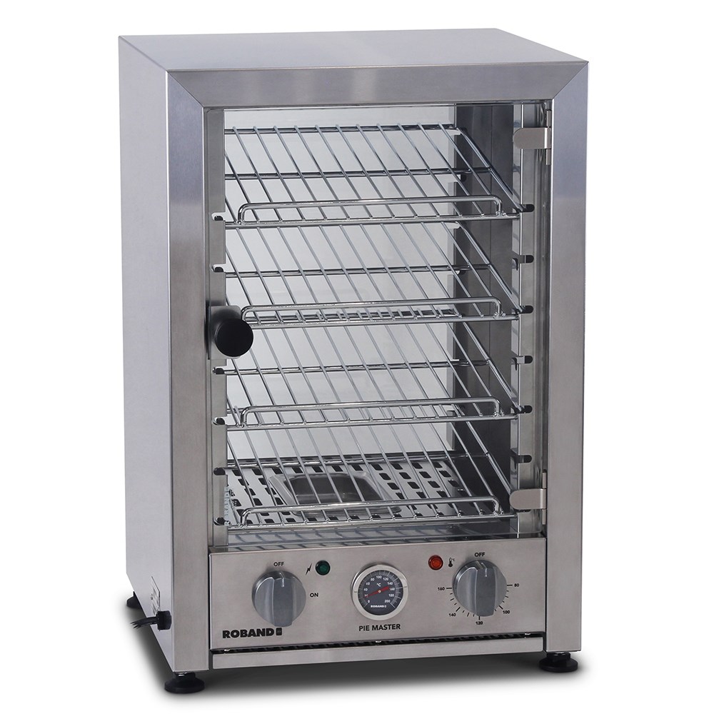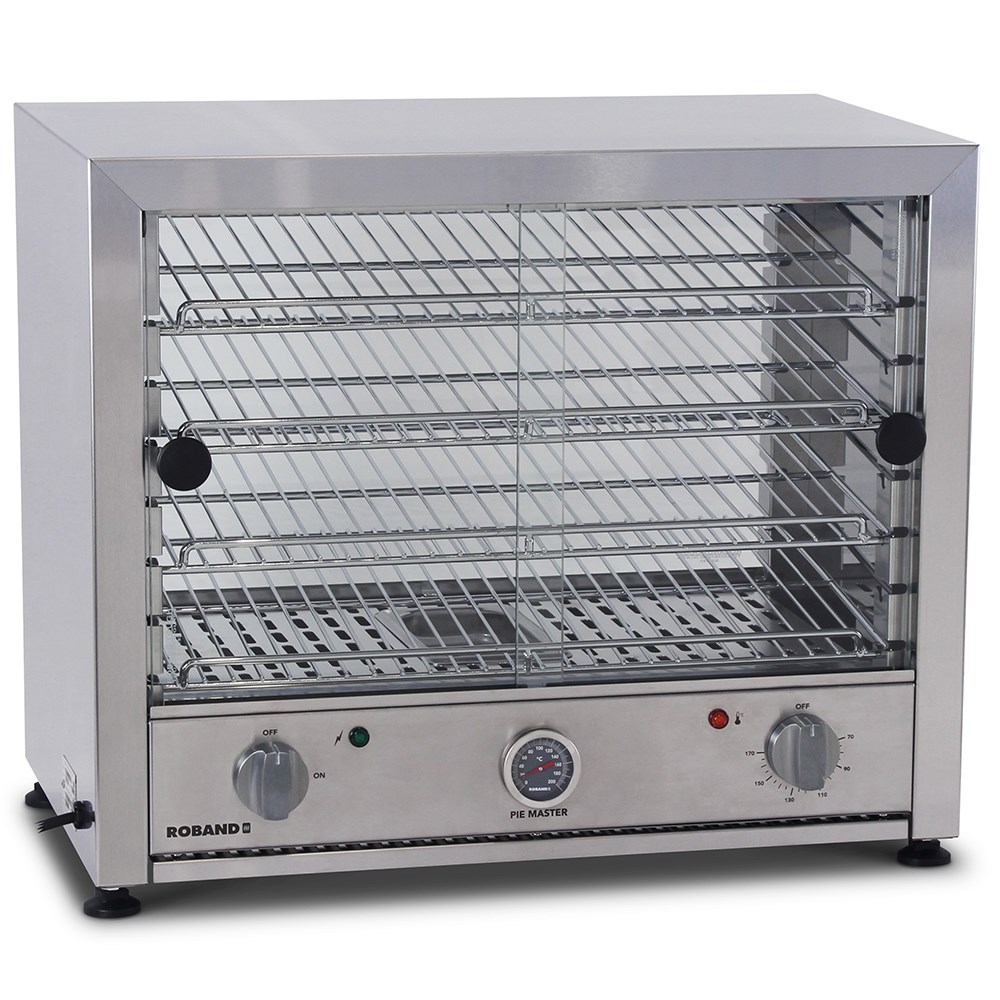 The PM-Series or Roband Pie Ovens features a brushed stainless steel body and adjustable feet and an easy to remove crumb tray for ease of cleaning. The display racks in these ovens can be positioned horizontally or at an angle and there is a stop rail on each shelf to prevent food from touching the glass doors and this range has the added benefit of an internal light to enhance the presentation of your food. There are three variations of these ovens available: ZF100677 - Pie Warmers with a stainless steel back and front-facing glass doors, with an internal light and baffle tray with steam. Three sizes available. ZF100676 - Pie Warmers with a stainless steel back and front-facing glass doors. Three sizes available. ZF100679 - Pie Warmers with front and rear facing glass doors. Two sizes available.