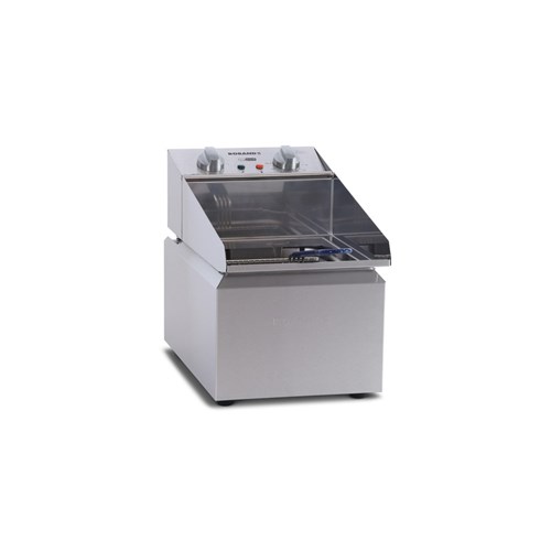 This single pan fryer, manufactured in Australia, provides high performance whilst freeing up valuable counter-top space, stainless steel construction, precise thermostat control, min & max oil level markers, bevelled fryer body for easy tank removal, isolating switch, insulated basket handle, element guard & safety over-temp cut-out.