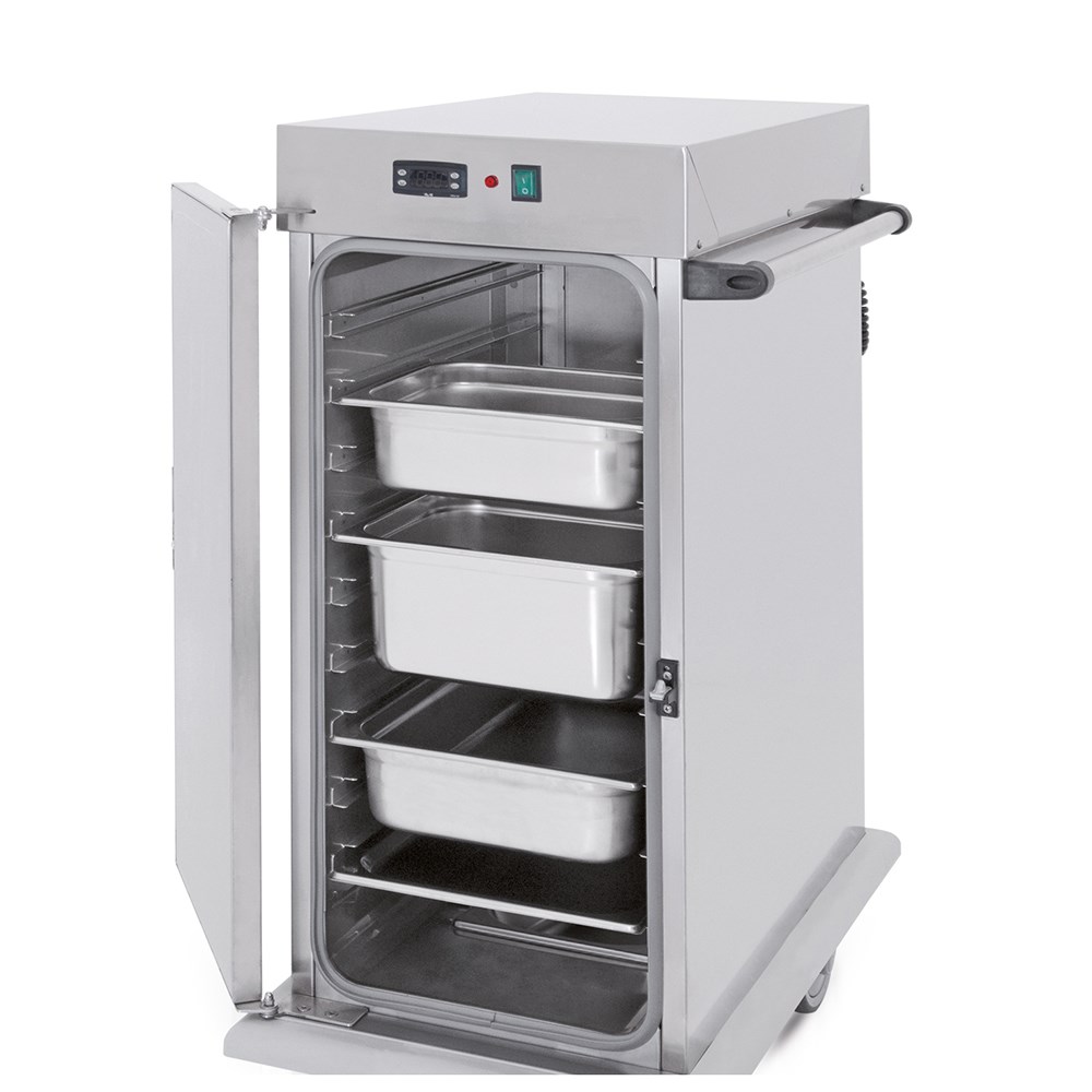 This mobile hot cupboard has a spacious interior that can accommodate up to 10 full-size 1/1 gastronorm trays, making it perfect for large-scale food preparation and storage. The cupboard is made of durable stainless steel, which is easy to clean and maintain, ensuring a long lifespan.