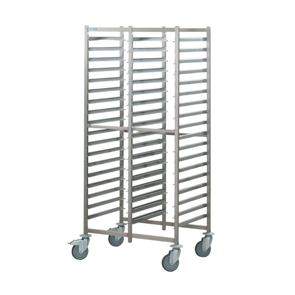 The Hupfer Gastronorm Trolley 2 Bay is a high-capacity, dual-compartment solution designed for efficient and hygienic storage of up to 36 GN 1/1 containers. Made from durable stainless steel with a robust, self-supporting frame, this trolley features 36 pairs of welded U-shaped shelf rails with 75 mm spacing, offering 50% more capacity when using GN containers without lids (150 mm deep). Integrated push-through and tilt protection ensures secure tray handling on both sides.