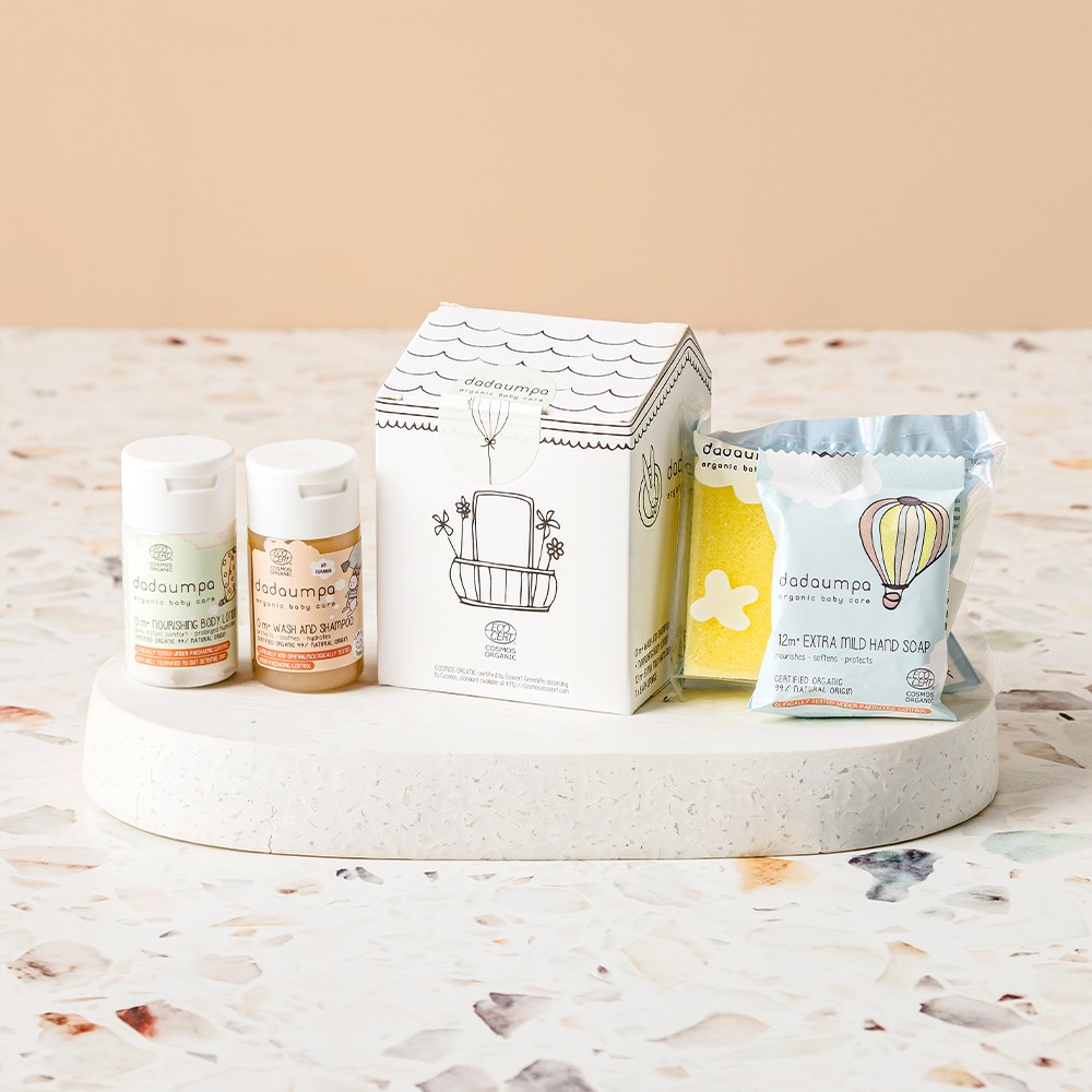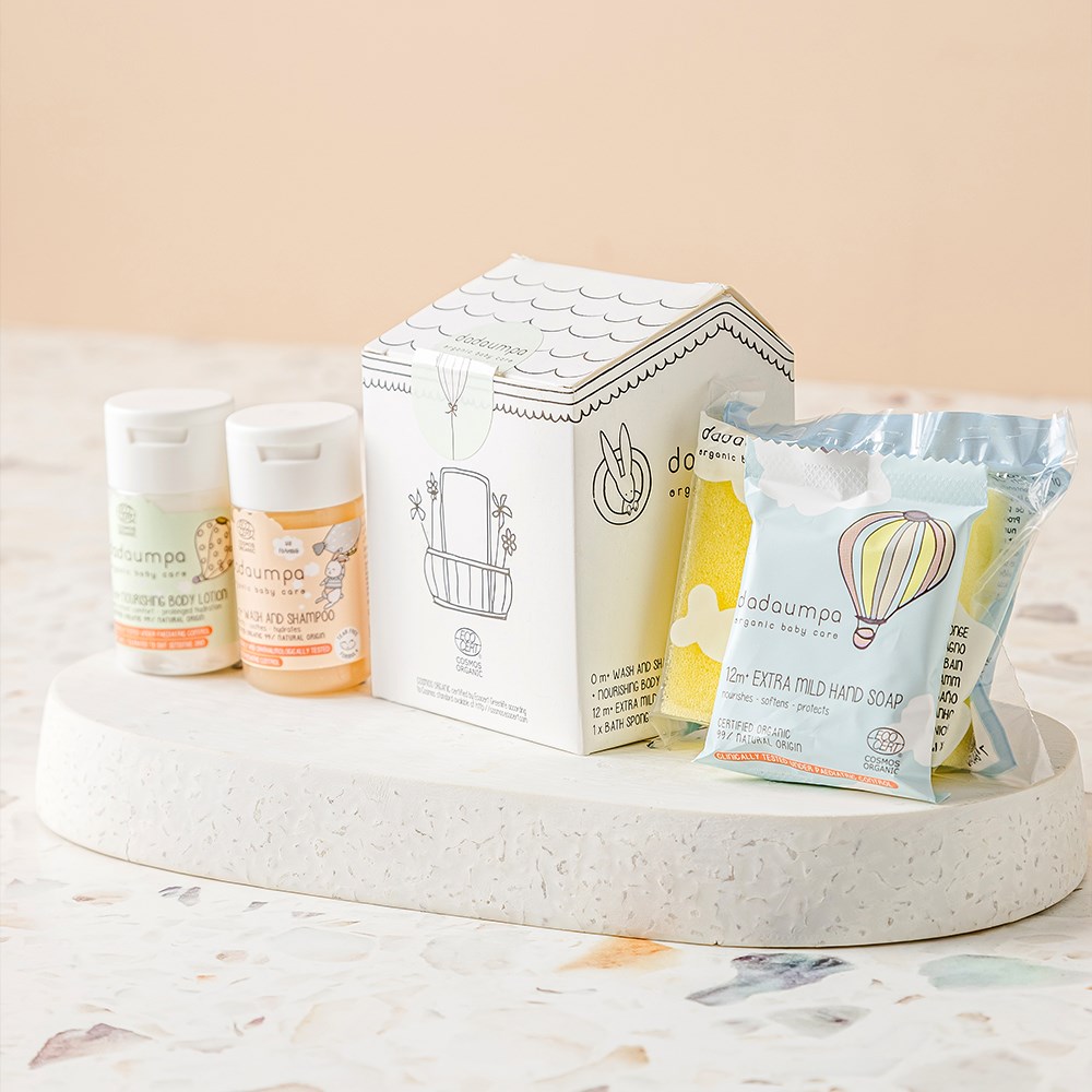 The Dadaumpa Baby Bath & Care Kit provides essential bathroom amenities for your youngest guests. This carefully curated kit includes wash and shampoo, body lotion, mild hand soap, and a bath sponge so your smallest guests stay clean and fresh. Thoughtfully packaged in an adorable house box, this kit is perfect for all types of accommodation venues, including hotels, resorts, and homestays.