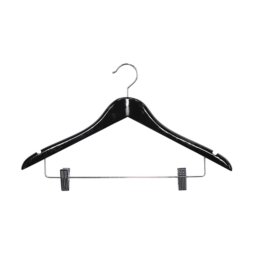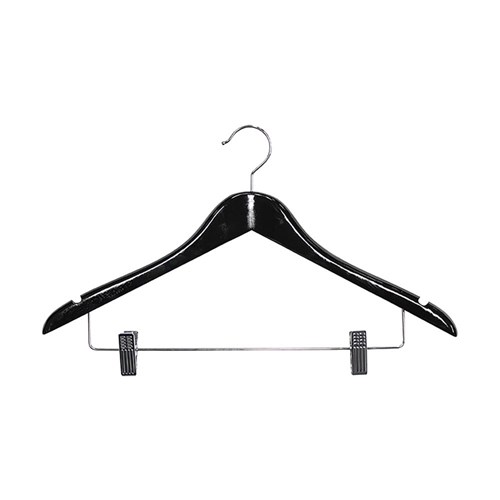 This great looking standard hanger has a metal hook and dark wood finish with indentations for garment loops - also features metal clips with protective ends for hanging skirts and trousers.