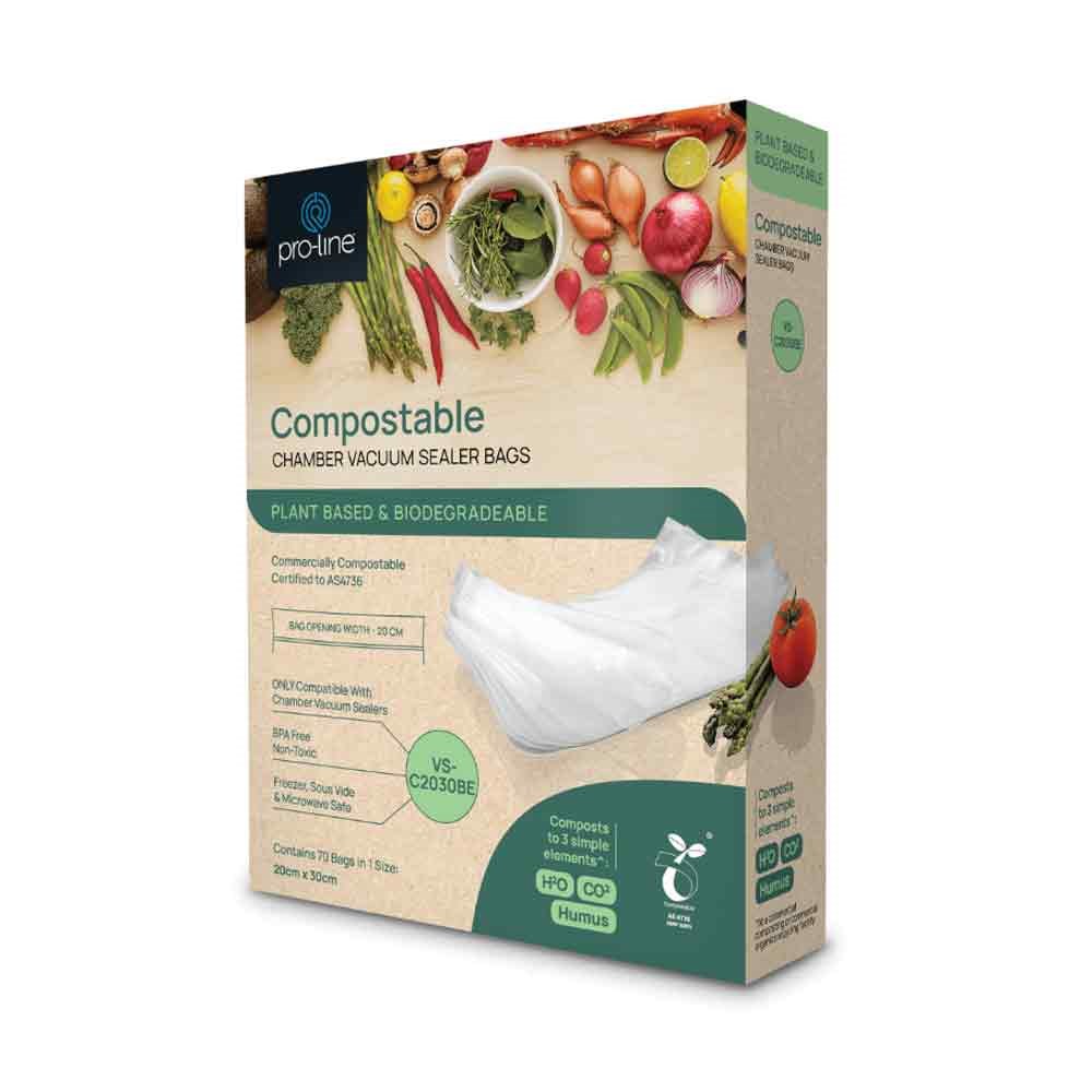 The Vacuum Seal Channel Bags Compost 200x300mm Pro-line offer an eco-friendly solution for food storage without compromising on performance. Made from plant-based and biodegradable materials, these bags are designed to function just like traditional plastic but with the added benefit of being compostable. Once discarded, they break down naturally into three simple elements: water, carbon dioxide, and humus, making them a sustainable choice for environmentally conscious consumers.
