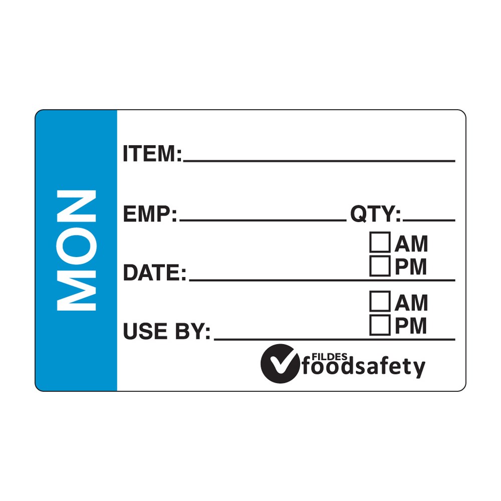 Fildes 49 x 75mm Dissolvable Prep Label "MON". combines colour coded day of week with prep label allowing for important prep information including the item, date prepared and use by date to be recorded. Not suitable for fridge or freezer applications.
