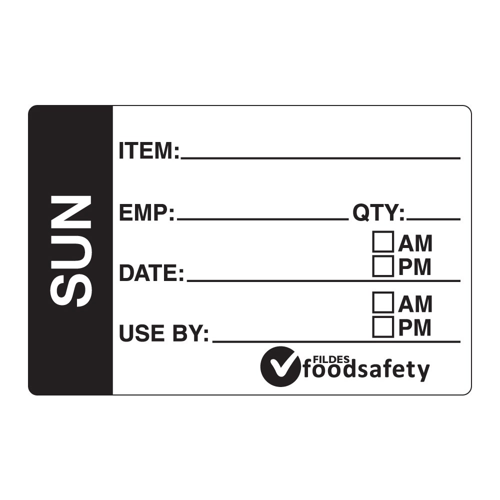 Fildes 49 x 75mm Removable Prep Label "SUN". Combines colour coded day of week with prep label allowing for important prep information including the item, date prepared and use by date to be recorded. Indispensable for food rotation practices.