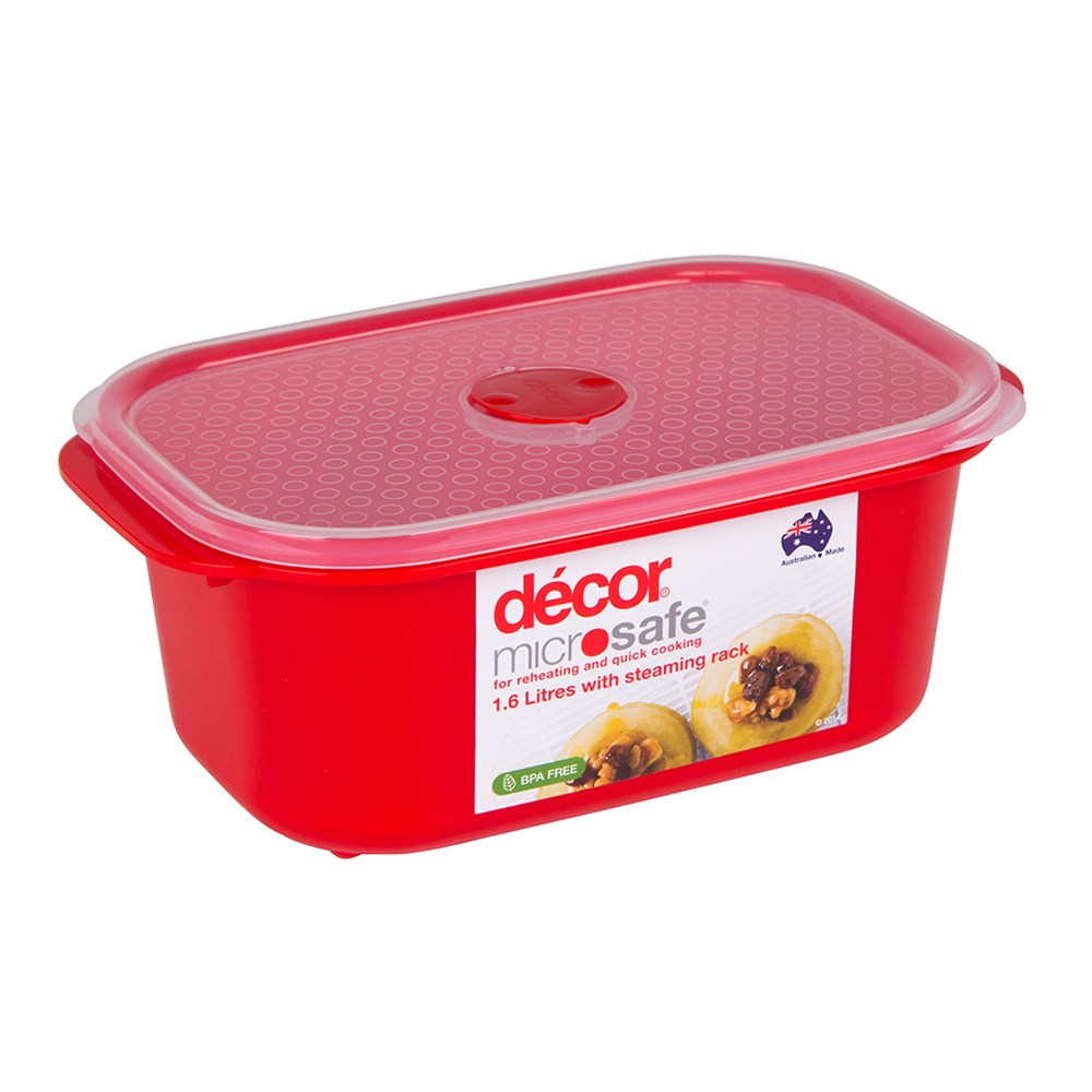 Decor Microsafe® containers have been specifically designed for quick microwave heating and cooking. Perfectly steam meat, fish and vegetables in minutes with the included steaming rack which can be removed when not required. Stack Microsafe® containers on top of each other in the microwave to heat numerous things at once or freeze meal portions in the containers for reheating later.