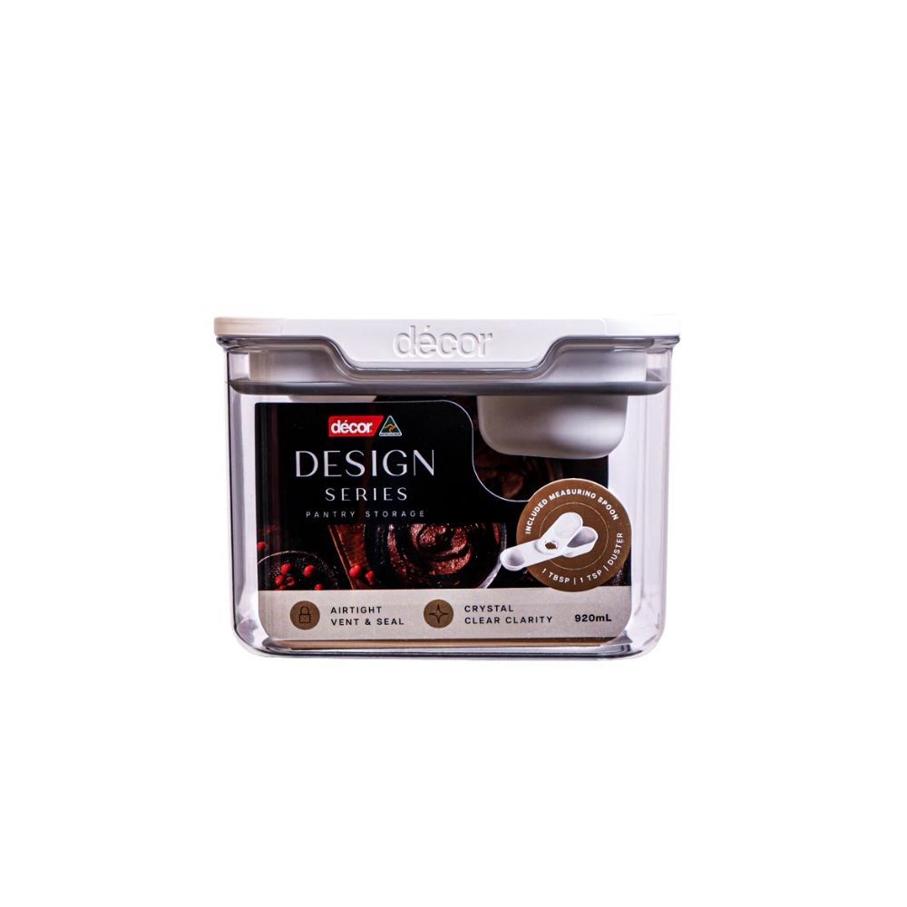 The Design Series Pantry Container 920ml Clear with White Lid by Decor combines style and practicality for a perfectly organised pantry. Its modular design allows for easy stacking, while the crystal-clear body ensures quick visibility of ingredients. The airtight vent button keeps contents fresh, and the flat-rimmed white lid enhances storage efficiency. An inbuilt accessory provides precise measuring, making food prep effortless.
