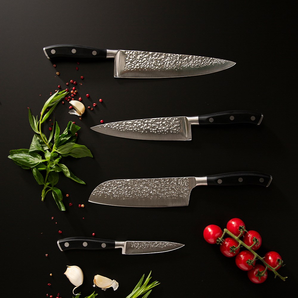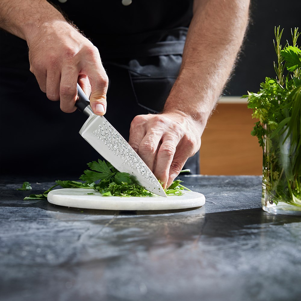 A standout feature of the Okito range of professional kitchen knives is the hammered metal finish which not only adds a striking visual appeal, but it also serves a practical function. The hammered texture creates small air pockets between the blade and the food, reducing drag and minimising instances of food sticking to the knife. This allows for faster, smoother cuts which is ideal for chefs working in high-speed, high-efficiency kitchens.