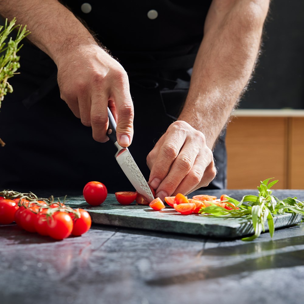 A standout feature of the Okito range of professional kitchen knives is the hammered metal finish which not only adds a striking visual appeal, but it also serves a practical function. The hammered texture creates small air pockets between the blade and the food, reducing drag and minimising instances of food sticking to the knife. This allows for faster, smoother cuts which is ideal for chefs working in high-speed, high-efficiency kitchens.