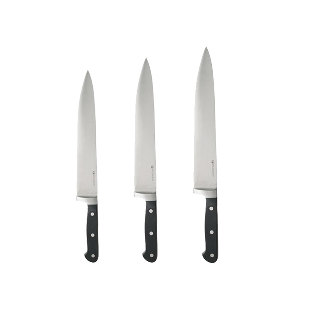 Qualicoup Chefs Knives are set in the perfect combination of quality and affordability. Equipped with stainless steel blades, three rivet solid bolster handles and a sleek ergonomic design, whatever the task, these knives will consistently perform in the kitchen.