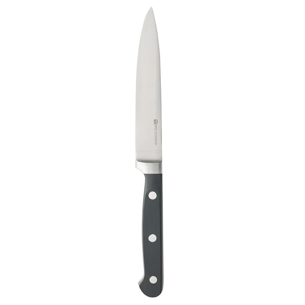 The Qualicoup Paring Knife 90mm Pro.cooker is a high-quality yet affordable kitchen essential. Featuring a sharp stainless steel blade, this knife ensures precise cutting for all your paring tasks. Its three-rivet solid bolster handle provides strength and stability, while the ergonomic design offers a comfortable and secure grip for extended use.