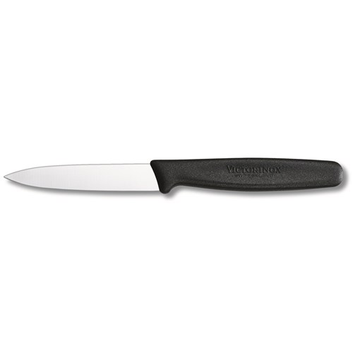 The Paring Knife 80mm Point Tip Black Nylon Handle Victorinox is designed for precision and durability in professional kitchens. Crafted with a high-quality stainless steel blade, it features an optimal hardness and laser-tested cutting angle for long-lasting sharpness. The pointed tip allows for detailed peeling, slicing, and intricate cutting tasks.