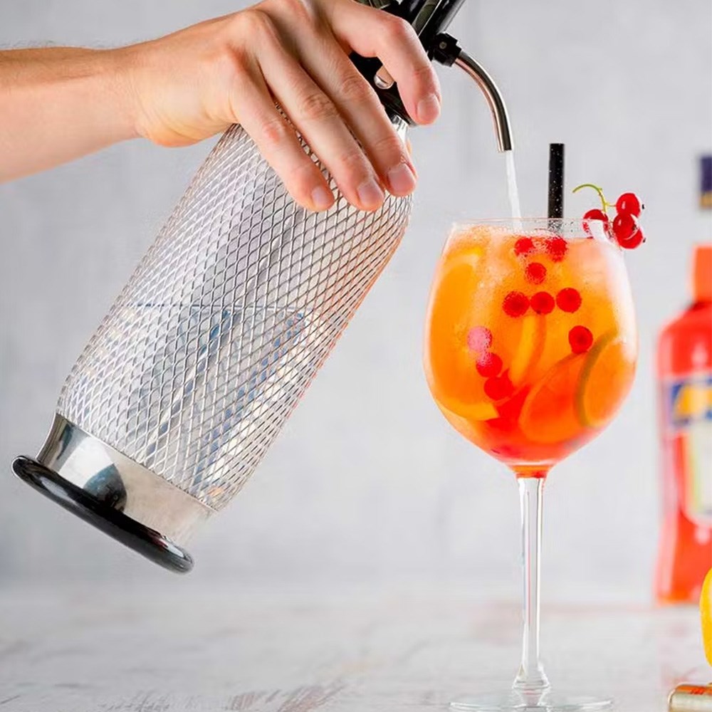 The iSi Soda Syphon SodaMaker Classic has a 1L capacity and produces fresh sparkling water, carbonated juice drinks, wine spritzers, and handcrafted cocktails, making it perfect for pubs, cocktail lounges, cafes, restaurants, and resorts. Its stainless steel mesh design has been recreated for today's customers with steady stream technology. With its dripless pouring spout, it avoids drips when prepping the drinks. The mesh design not only offers a classic look but also protects the glass bottle.