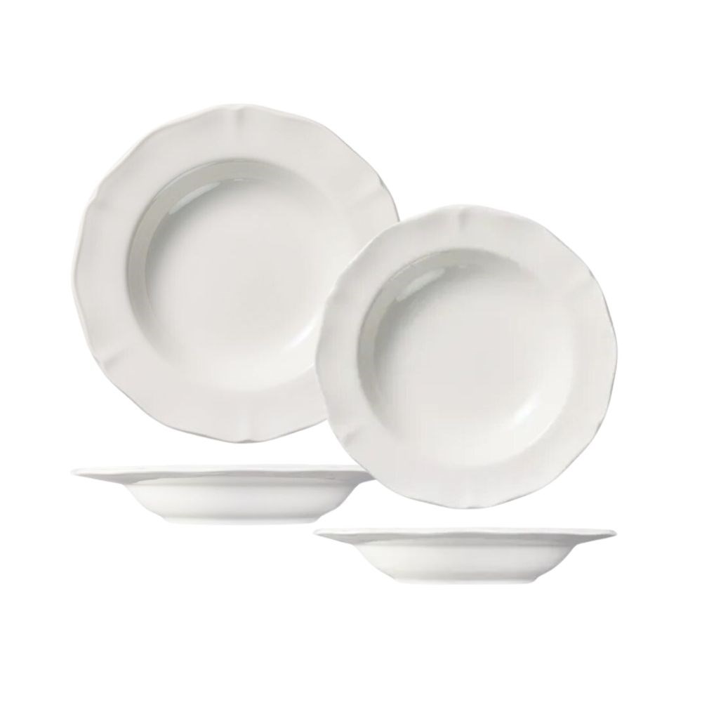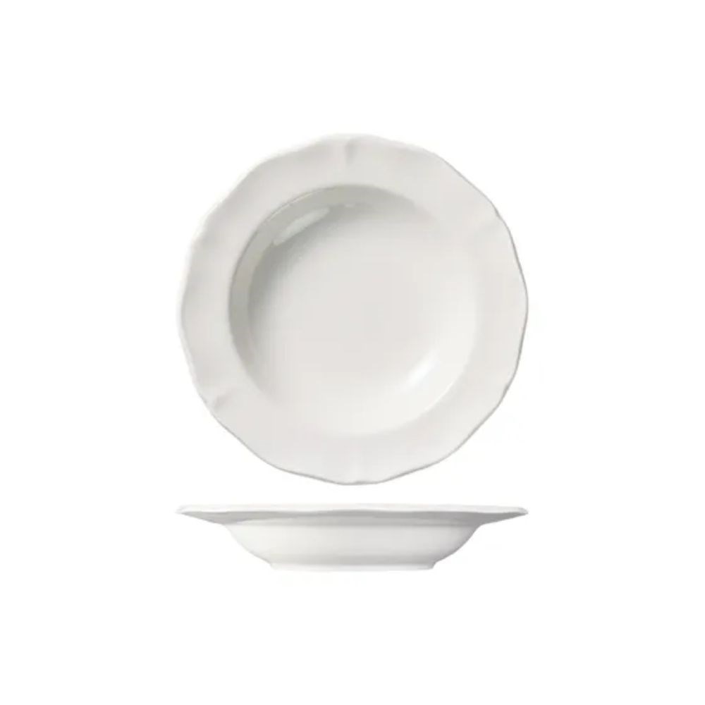 The Astoria Soup Pasta Bowl White Luzerne features a classic scalloped design, crafted from creamy ivory new bone china. Its elegant, timeless silhouette enhances any tabletop, making it ideal for serving soups, pastas, and other dishes. With its refined look and sturdy construction, it adds sophistication to the dining experience.