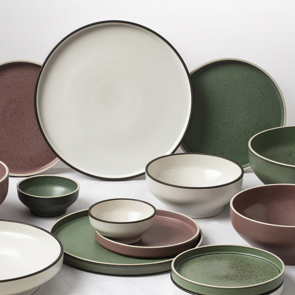 The Mod stoneware collection is available in Smokey Basil, Smokey Plum, Dusted White and Midnight. Each piece features accented banding and subtle glaze spatters resulting in stunning pieces that look great on their own or perfect to mix-and-match in dining settings.