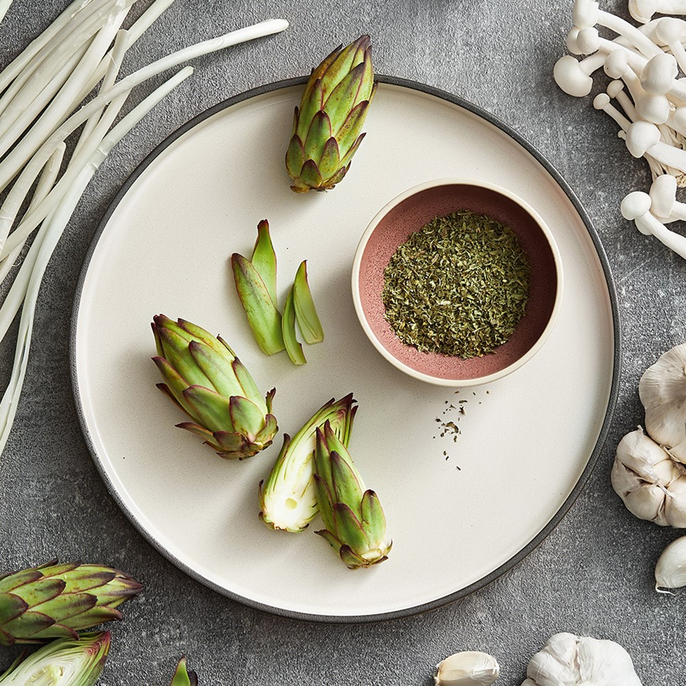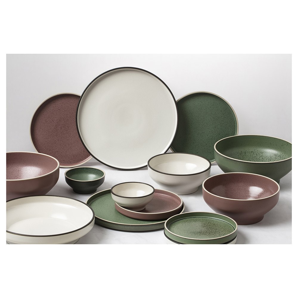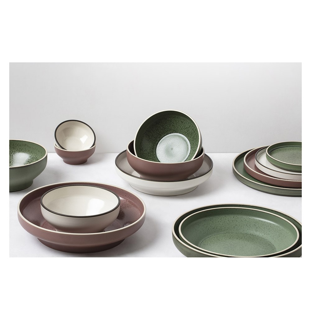 The Mod stoneware collection is available in Smokey Basil, Smokey Plum, Dusted White and Midnight. Each piece features accented banding and subtle glaze spatters resulting in stunning pieces that look great on their own or perfect to mix-and-match in dining settings.