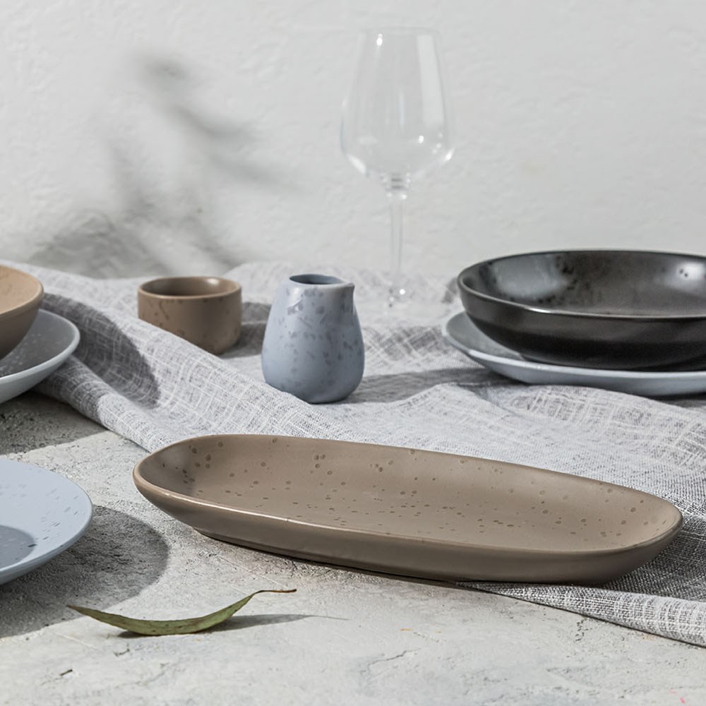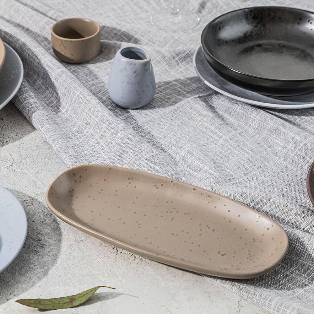 The Element Oval Platter Earth 360mm by Pro.mundi brings elegance and durability to your table. Inspired by Earth's natural minerals, this commercial-grade porcelain platter is designed to withstand the demands of fast-paced dining while showcasing your menu with its unique speckled texture and semi-matte finish. While the finish enhances visual appeal, it is best suited for light cutting and not recommended for serrated knives or heavy-duty use.