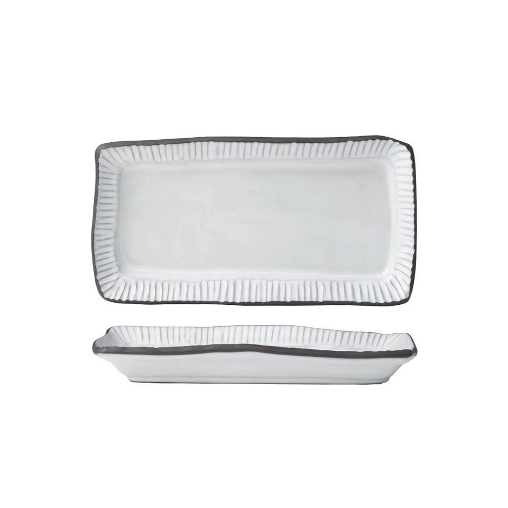 The Linea Organics Rectangle Platter 300x160x40mm White Tablekraft features a decorative irregular rim with tactile ridges, adding a unique and sophisticated touch to any dining experience. Hand-glazed for a smooth finish, it pairs effortlessly with Tablekraft Linea White and Muse collections, offering versatile styling options for a range of occasions.