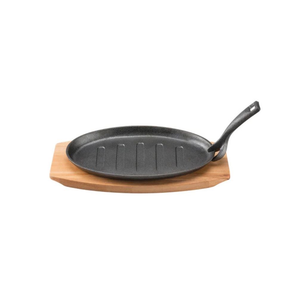 Complete with a custom maple tray, it's designed for safe table service and heat protection. Whether you're hosting a barbecue or cooking over a campfire, this oval plate suits all heat sources including induction. Rugged, reliable, and made for sizzling presentation.