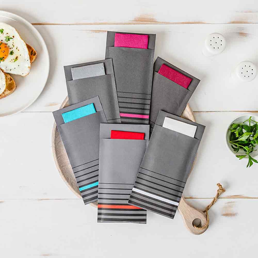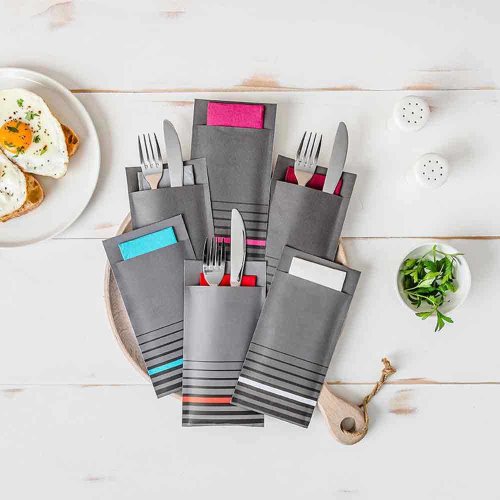 Add a touch of elegance to your table with the Isi Paper Cutlery Pouch Grey/Raspberry 200x100mm by Pro.mundi. These stylish pouches feature a modern grey and raspberry striped design and come with a matching 2-ply quilted napkin, offering both sophistication and functionality. The sleek grey and vibrant raspberry colour combination adds a contemporary and lively touch to your table setting, making it ideal for a variety of occasions.