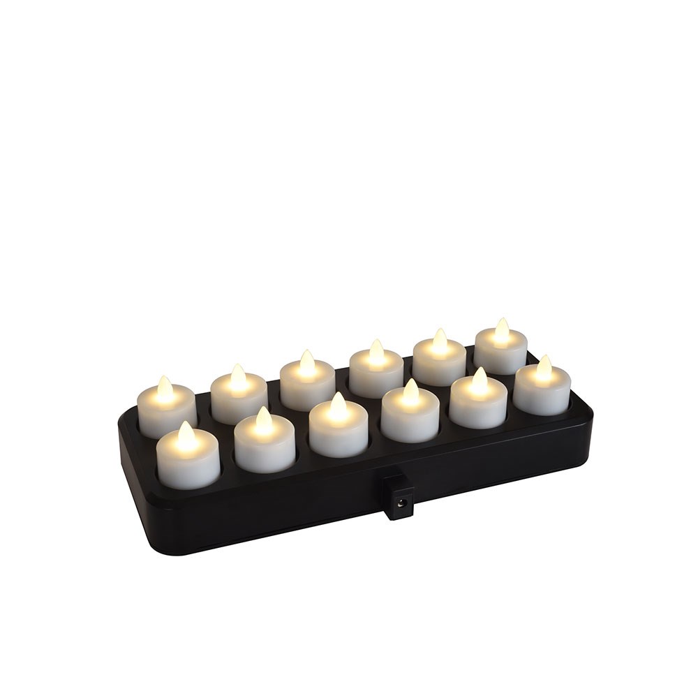 • A set of 12 LED lights includes a charging base