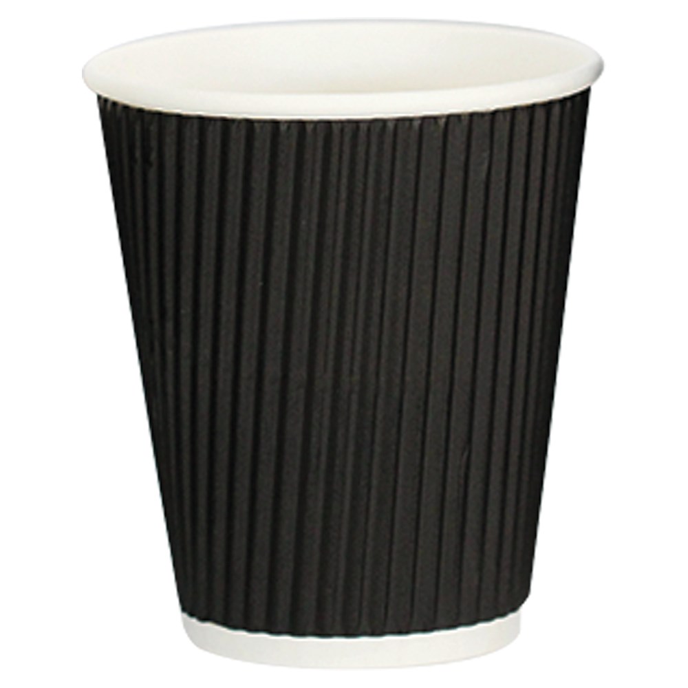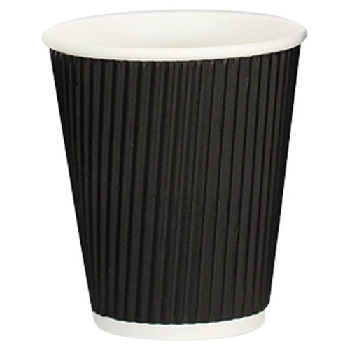 The Vee Insulated Coffee Cup Black 355ml by Essentials Collection is a smart, cost-effective option for serving hot drinks. Crafted from triple-walled cardboard, its ripple texture keeps drinks warm while ensuring hands stay cool, eliminating the need for sleeves.