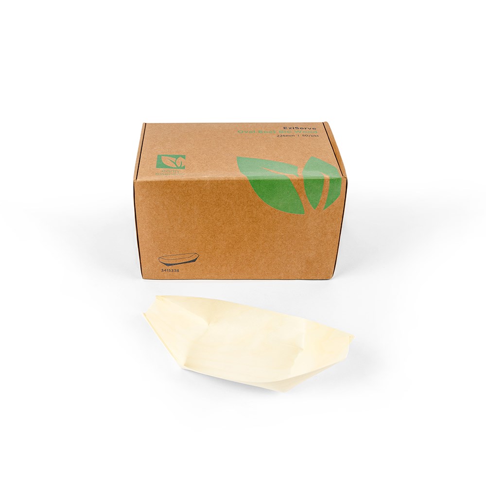 This 225x110mm food boat in the EziServe range by Earth Essentials is a versatile and eco-friendly serving solution designed to meet the diverse needs of the food service industry. Crafted from high-quality, sustainable and biodegradable materials, this food boat offers an environmentally responsible alternative to traditional serving methods. Its generous size makes it ideal for holding a variety of snacks, from crispy fries and succulent seafood to sweet churros and fresh fruit, accommodating larger portions for a satisfying serving experience.
