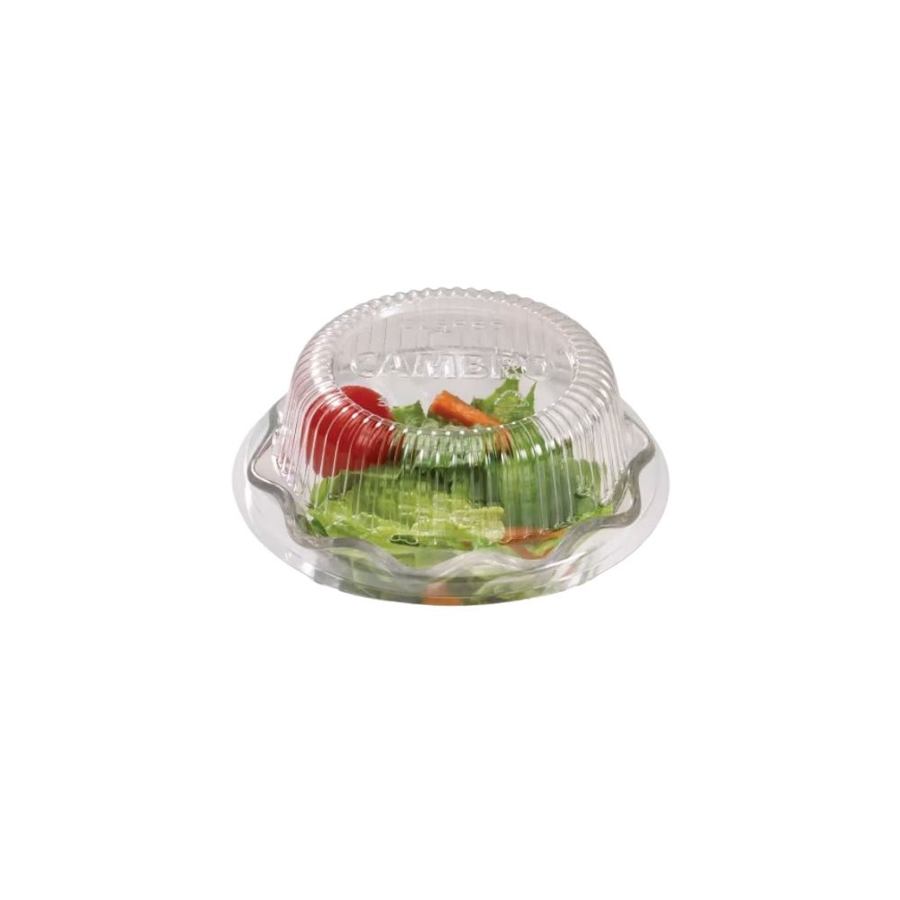 This clear disposable lid is designed to fit the Cambro SRB5CW135 Swirl Bowl, offering a raised profile to protect contents while enhancing food presentation. Made for commercial use, it's ideal for storing or transporting desserts and starters in high-volume service environments.
