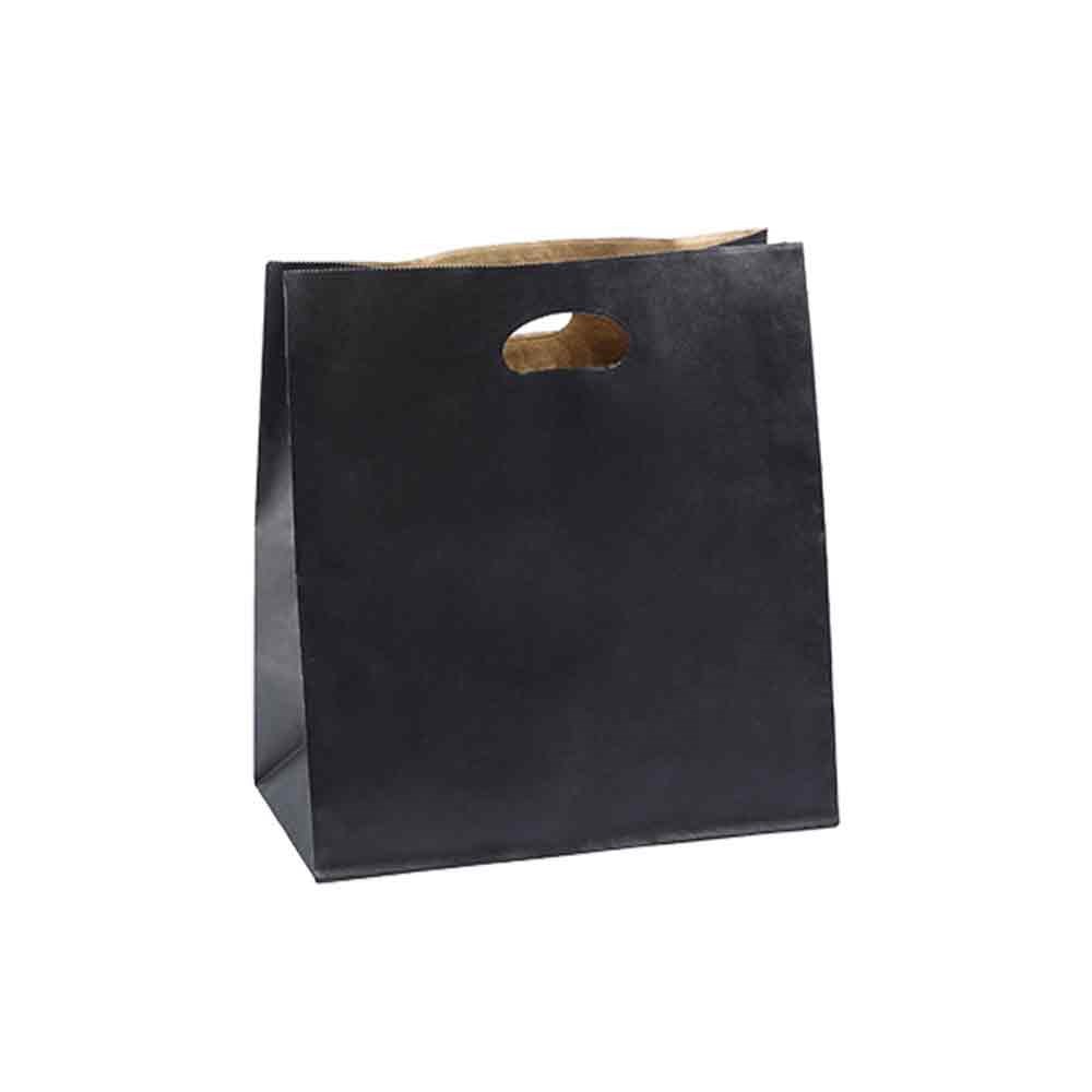 This Large 350x320x180mm Paper Bag in black is strong and features a die-cut handle for convenient use. Designed for versatility, these bags are ideal for a wide range of applications including retails stores, cafes, bakeries and so much more. Whether you're packing takeaway meals, retails purchases, or groceries, these bags are a reliable and environmentally conscious solution.