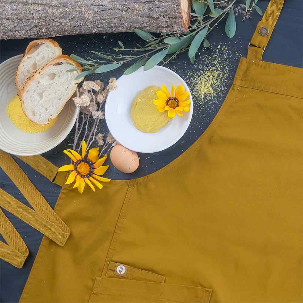 Measuring 86cm in length and 80cm in width, it features an adjustable neck strap and detachable waist straps for easy, tangle-free washing. With two hip pockets and a hidden pen pocket, this apron ensures practical storage for all your essentials. Available in six earthy tones, including the vibrant mustard shade, it's perfect for logo personalisation, making it a versatile addition to any hospitality setting.